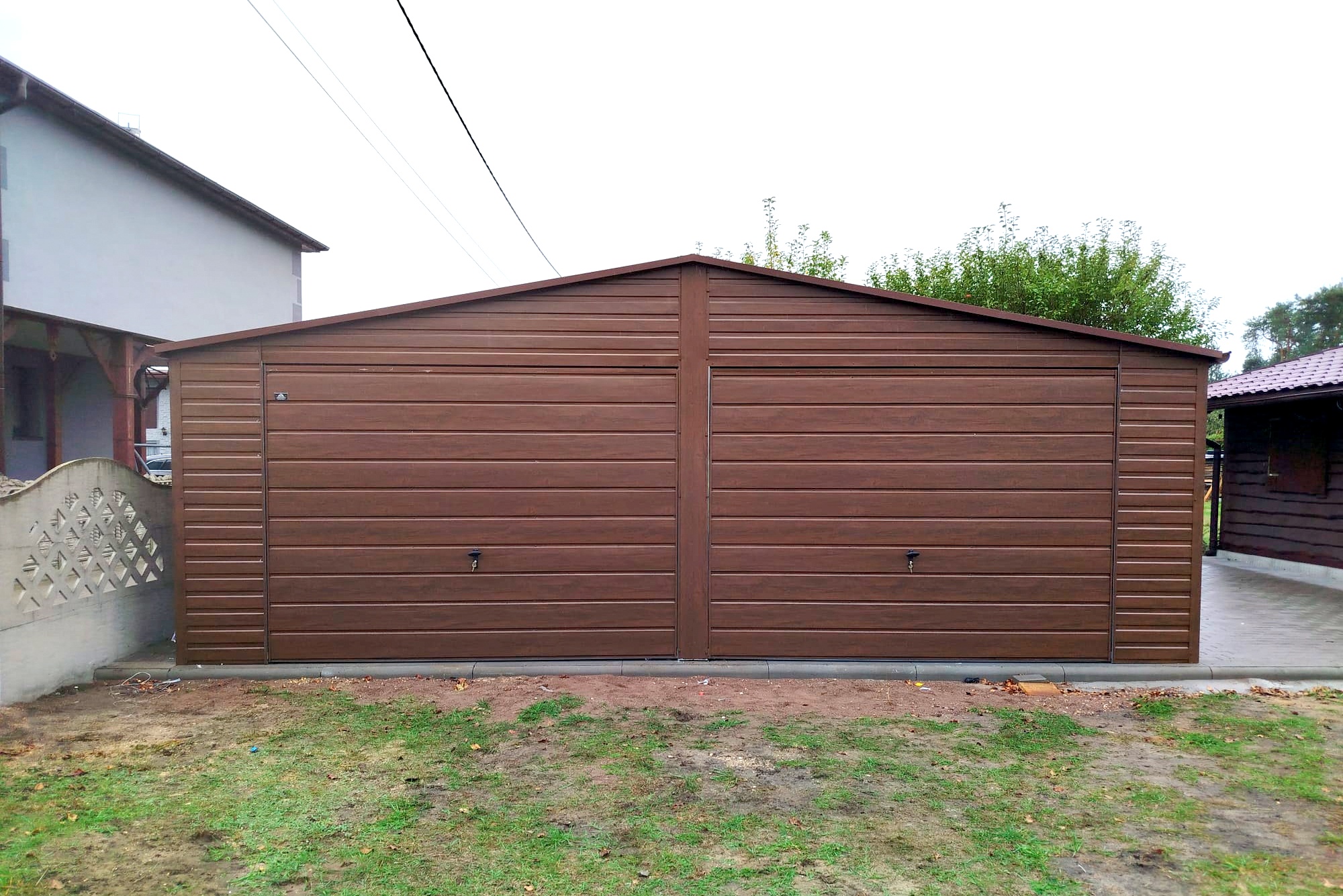 Garaż blaszany 7×6 – Dwustanowiskowy, Dach dwuspadowy, Kolor drewnopodobny orzech, Bramy uchylne, Drzwi wejściowe