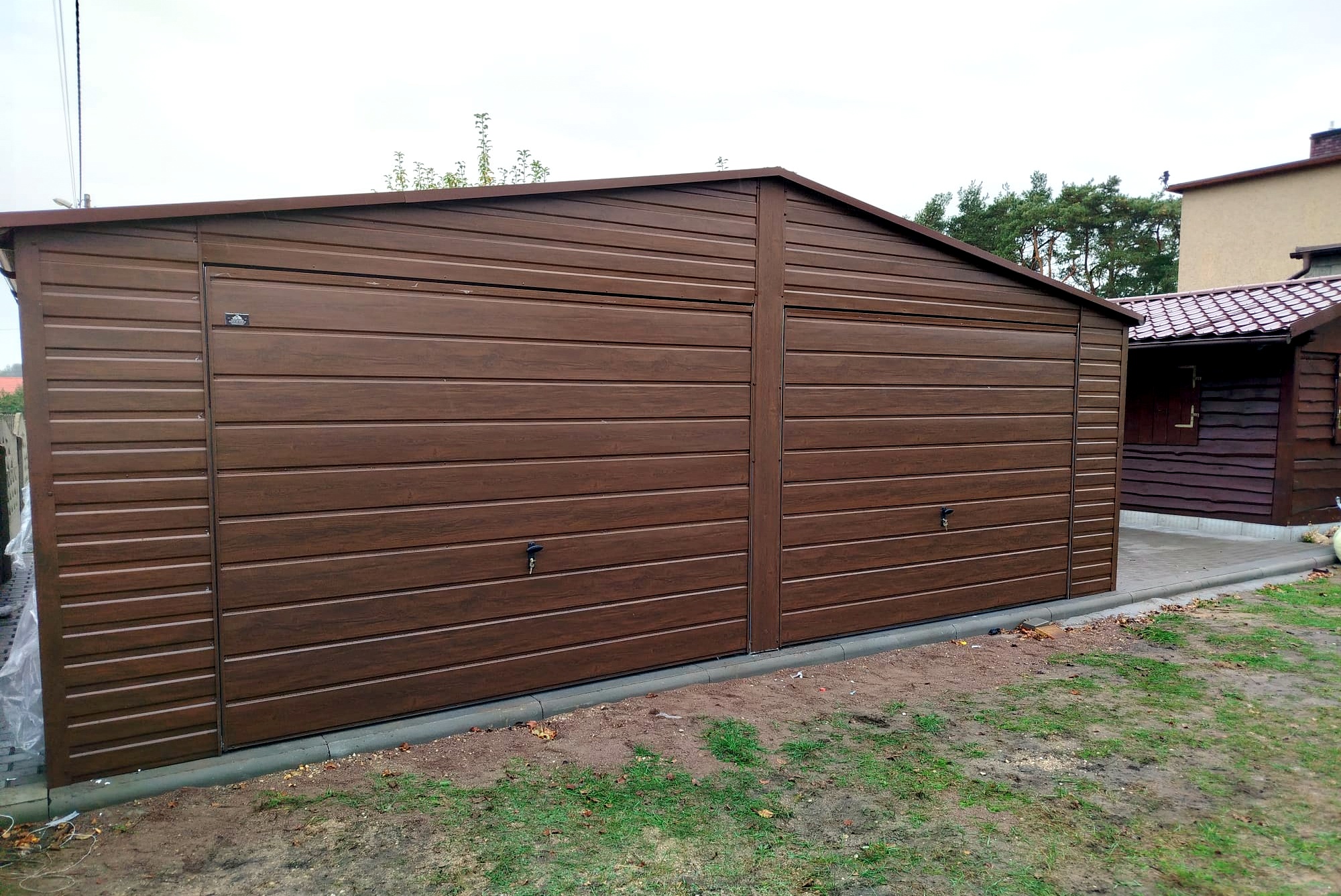 kolor drewnopodobny BTX ORZECH (bramy, drzwi, ściany) + brązowy mat BTX 8017 (dach)