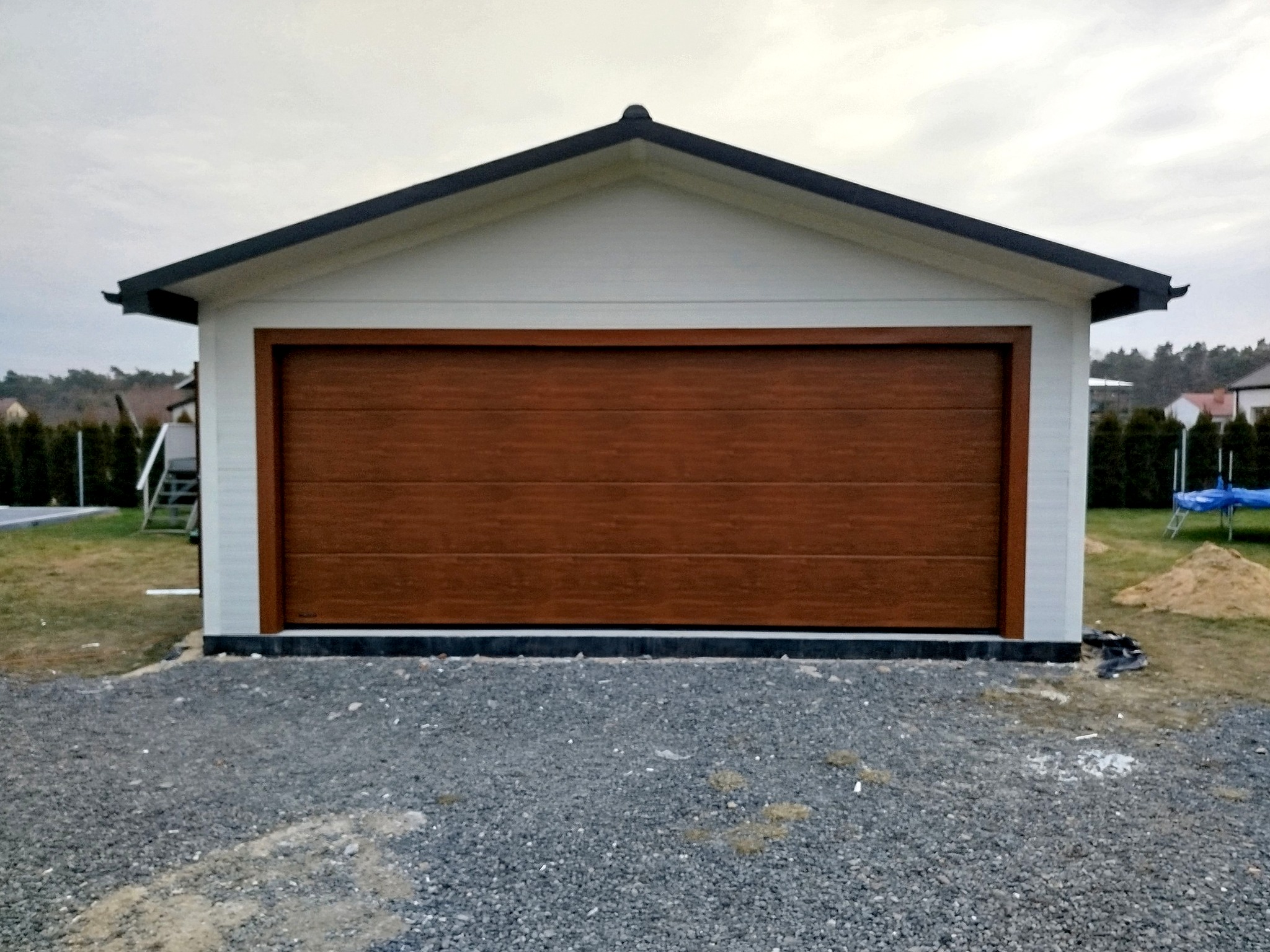 ✅ kolor biały połysk RAL 9010 (ściany) + drewnopodobny BTX ZŁOTY DĄB (brama) + antracyt mat BTX 7016 (dach)